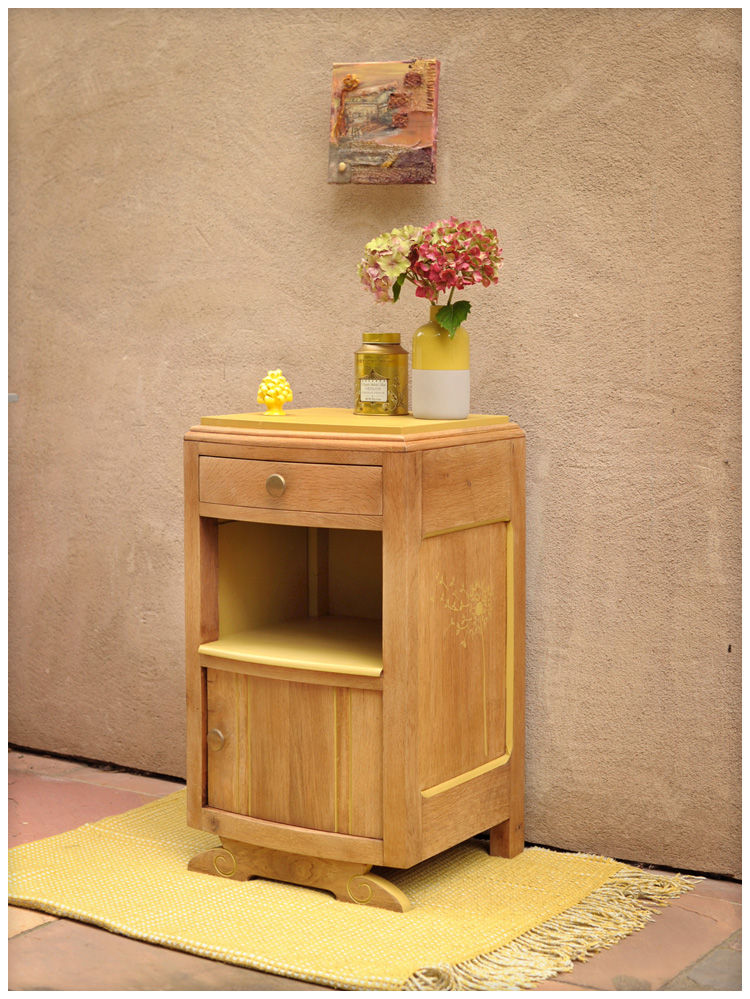 Une petite table de nuit qui sait toutefois se faire discrète car si son jaune illumine, il reste doux comme du satin. Dénudée de son vernis foncé, son bois de chêne a retrouvé son magnifique état naturel et se fond à merveille avec cette couleur ensoleillée.
