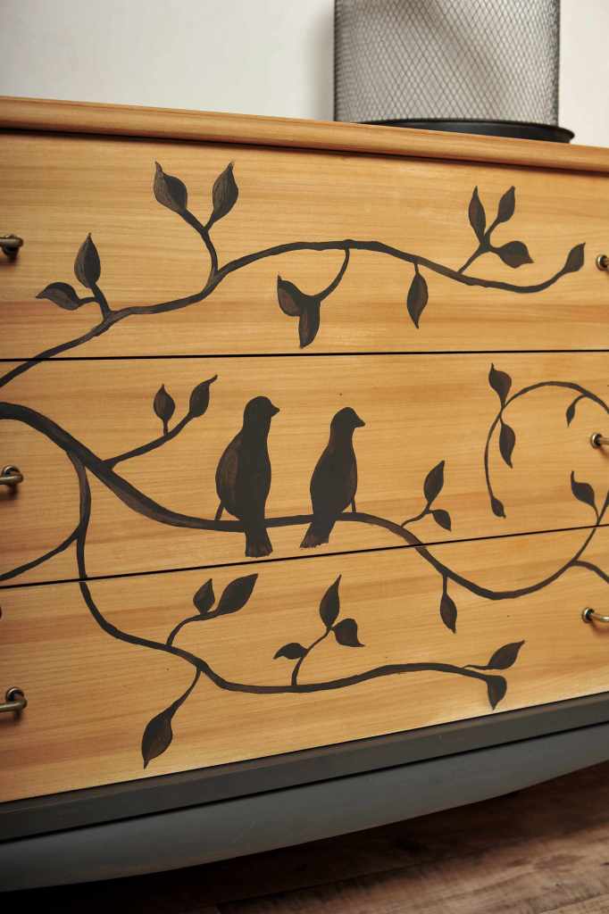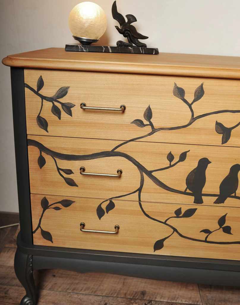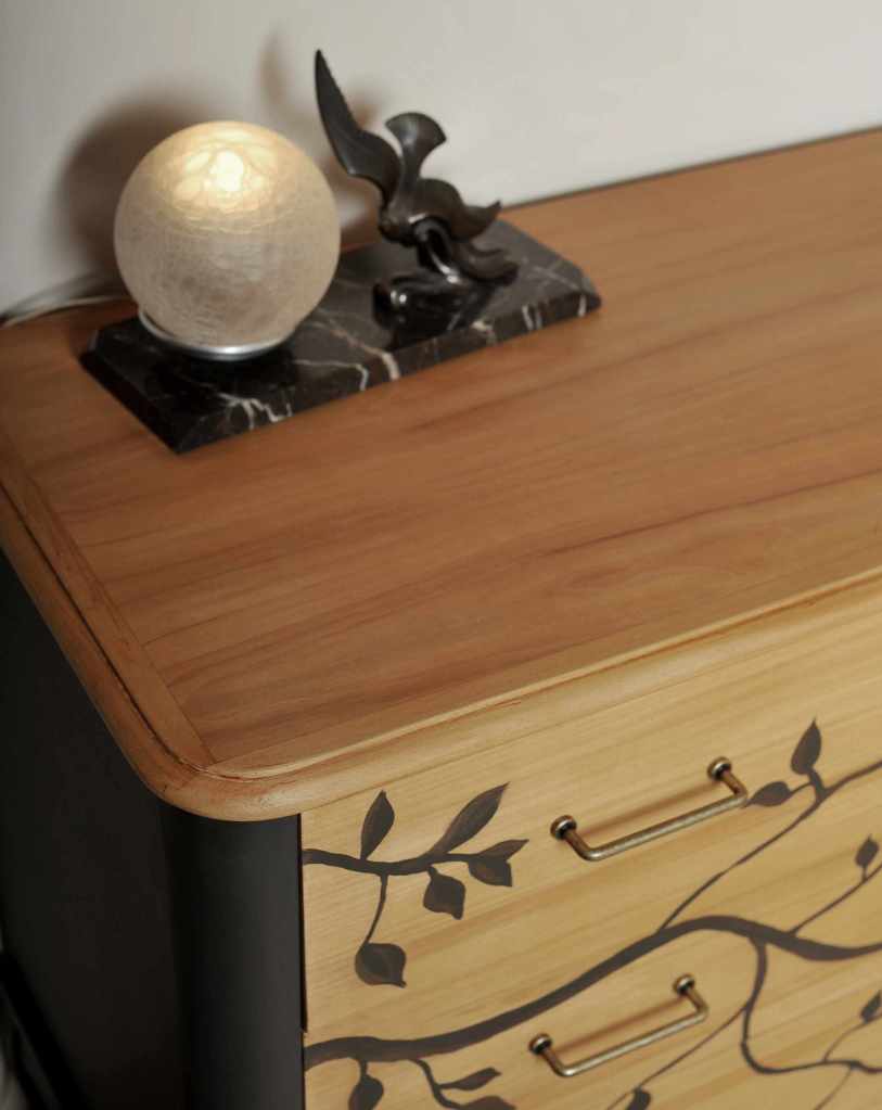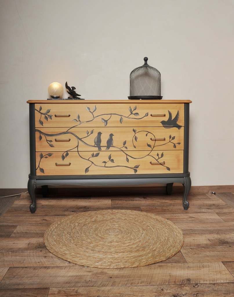 Elle était une commode rouge orangée comme on n’en veut plus, avec des baguette et des poignées rococo (voir dernière photo), elle est devenue légère, douce et pleine de poésie.