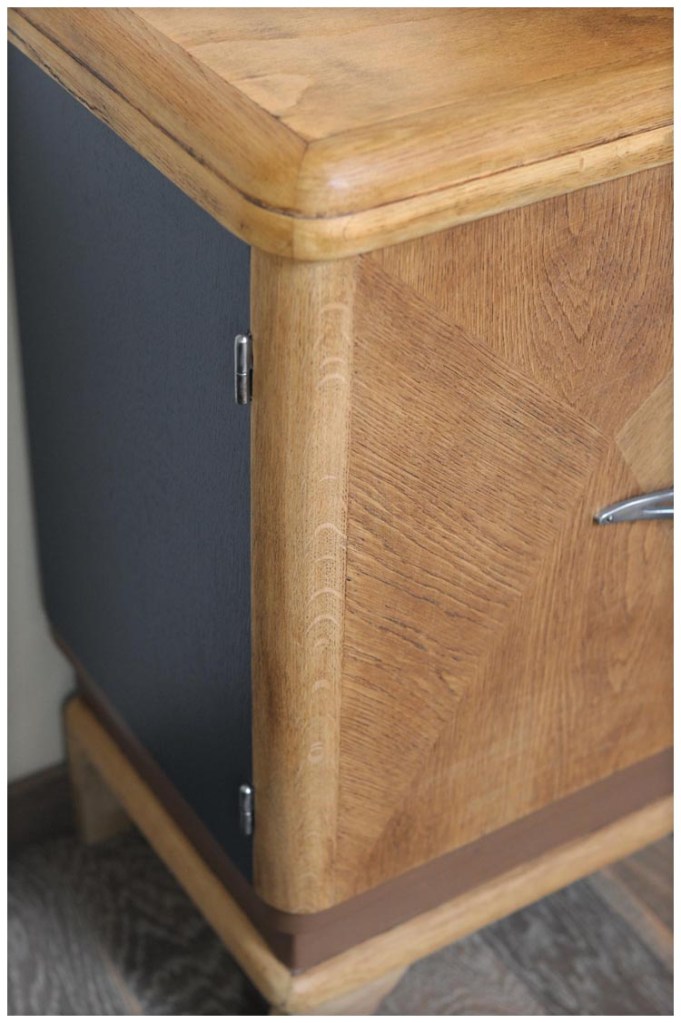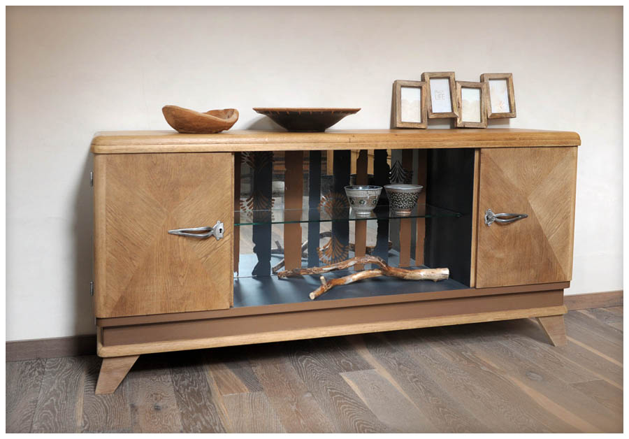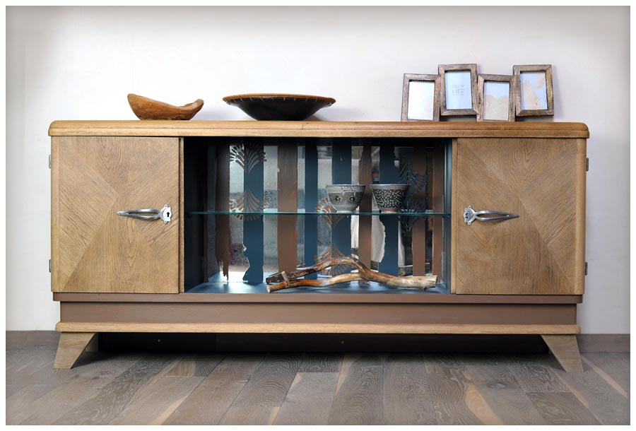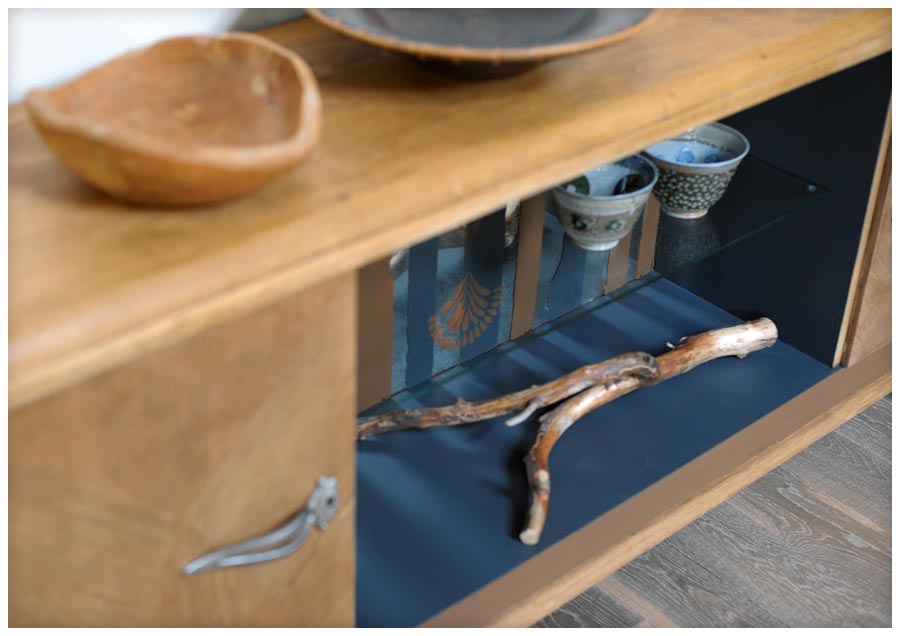 Pour les amoureux du chêne comme moi, il a retrouvé sa teinte naturelle réhaussée de gris bleuté sur les cotés et dans sa niche. Quelques motifs rétros peints à la main viennent habiller le miroir du fond subtilement piqué.