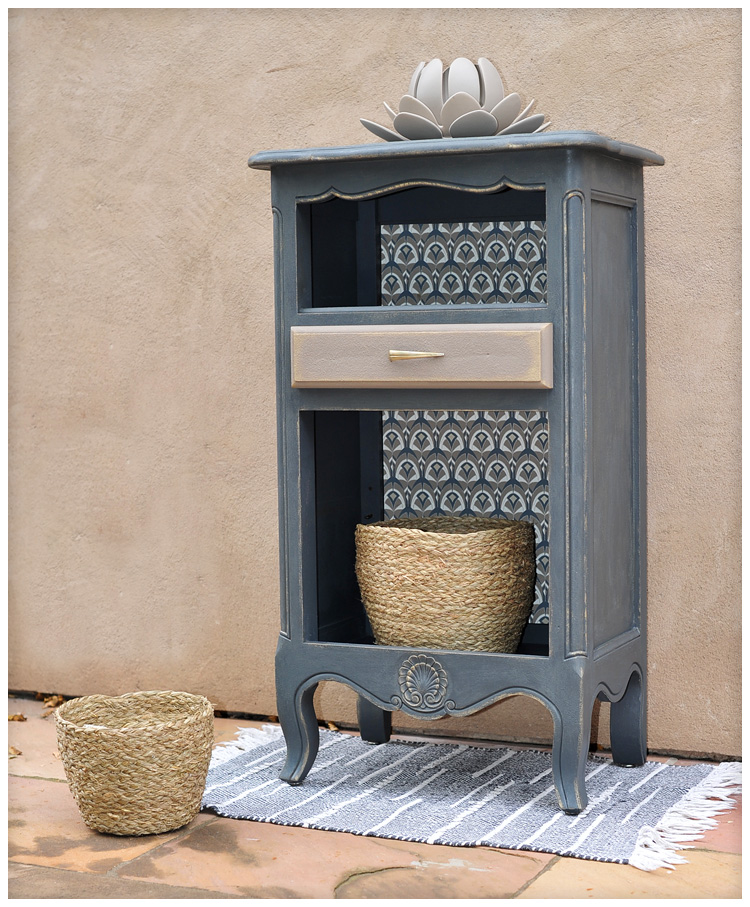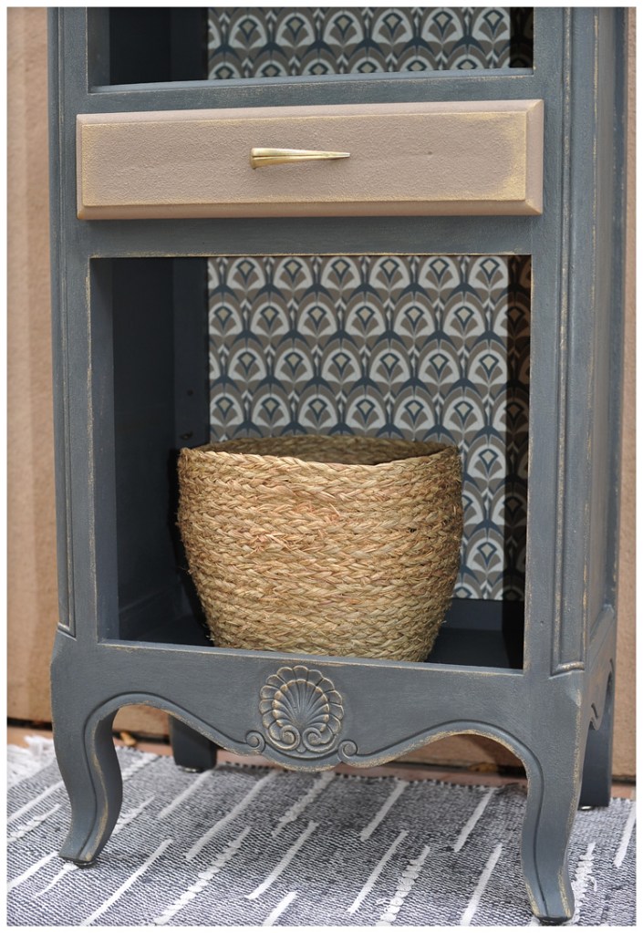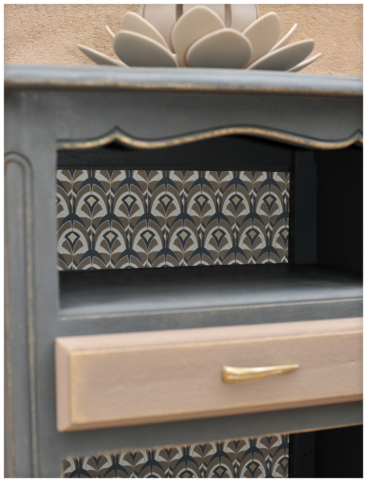 C’est le papier peint que j’ai appliqué au fond du meuble qui a guidé le choix des couleurs car j’ai eu pour lui un vrai coup de coeur.