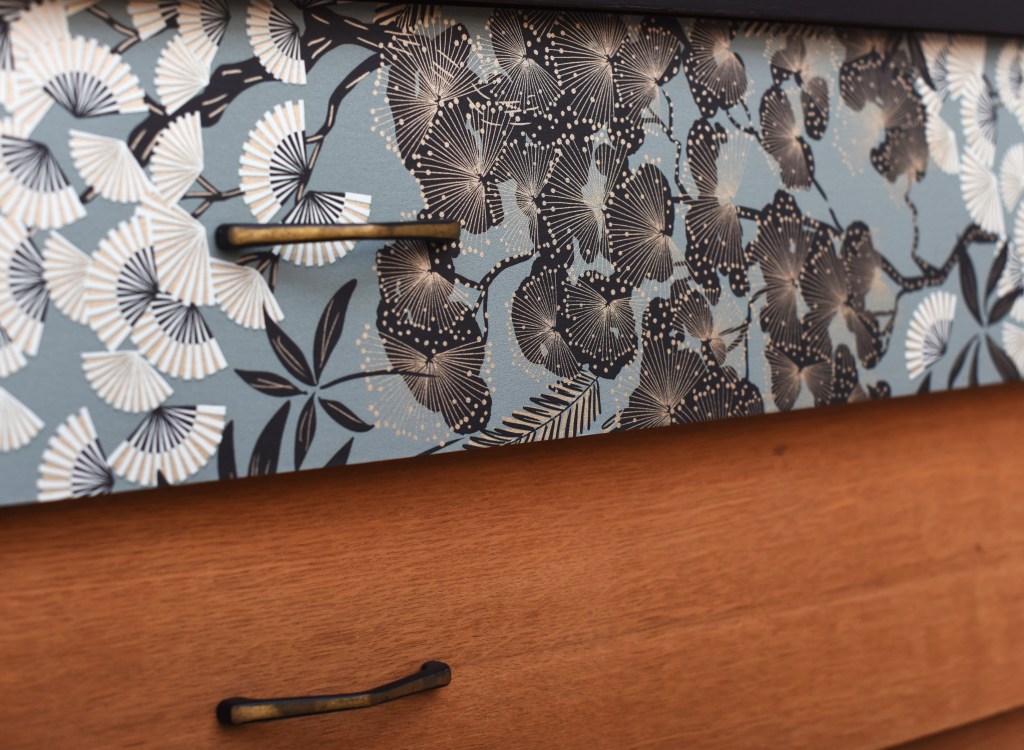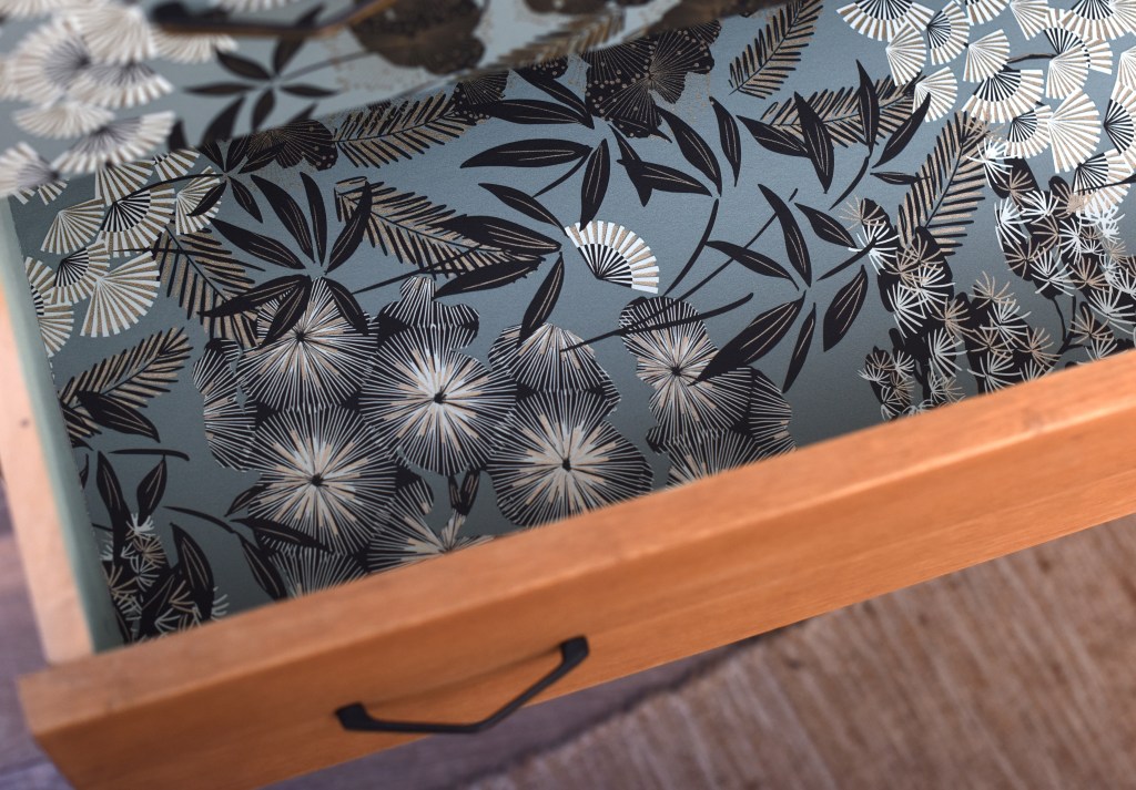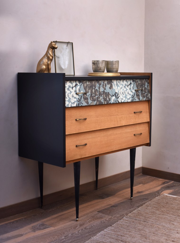 Son allure élancée, son habit noir, et son papier japonais lui apporte un petit côté chic. L’intérieur de ses trois tiroirs à été peint et paré du même papier.