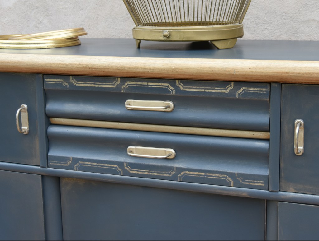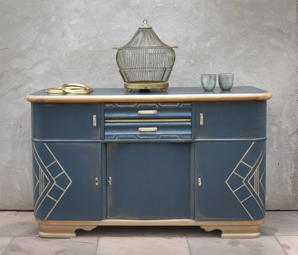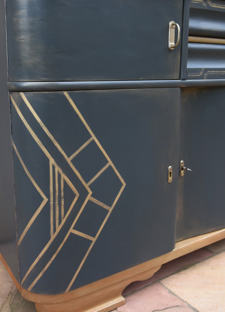 Tout de gris vêtu, relevé d’or, ses motifs peints main Art Déco séduiront l’amateur de meubles anciens que vous êtes
