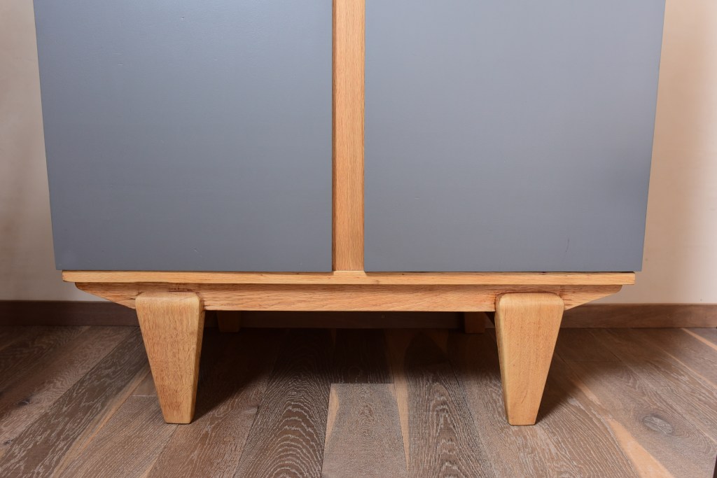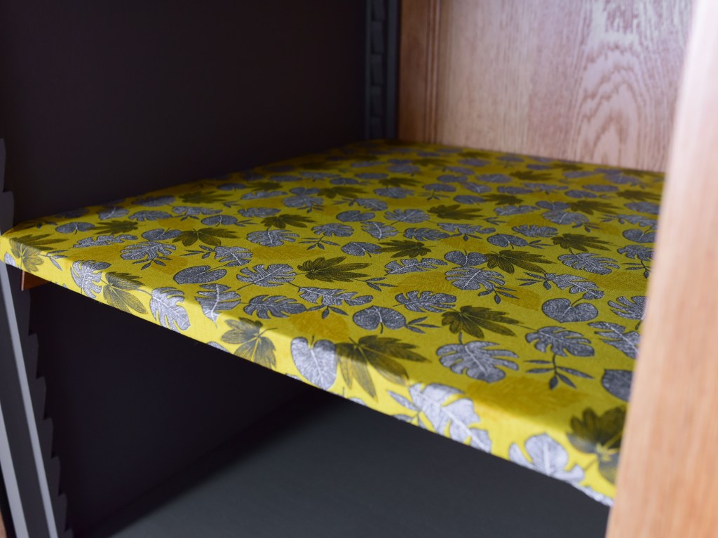 Son gris ardoise hyper tendance s’accorde à merveille à son teint naturel chêne clair et se réhausse en son intérieur d’un bel imprimé moutarde.